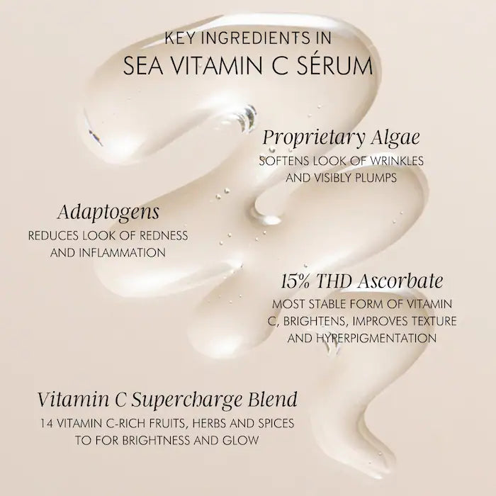 Caprylic/Capric Triglyceride, Helianthus Annuus (Sunflower) Seed Oil, Tetrahexyldecyl Ascorbate, Squalane, Passiflora Edulis Seed Oil, Moringa Oleifera Seed Oil, Algae Extract, Limonium Gerberi Extract, Crambe Maritima Leaf Extract, Aster Tripolium (Sea Starwort Oil) Extract, Ganoderma Lucidum (Reishi) Extract, Chlorella Vulgaris (Dermochlorella Algae) Extract, Panax Ginseng (Ginseng) Root Extract, Citrus Aurantifolia (Lime) Seed Oil, Fragaria Ananassa (Strawberry) Seed Oil, Curcuma Longa (Turmeric) Root Oil, Tocopherol, Ribes Nigrum (Blackcurrant) Seed Oil, Silybum Marianum Seed Oil, Thymus Vulgaris (Common Thyme) Extract, Psidium Guajava (Guava) Fruit Extract, Citrus Paradisi (Grapefruit) Fruit Extract, Petroselinum Crispum (Parsley) Leaf Extract,Terminalia Ferdinandiana (Kakadu Plum) Fruit Extract, Actinidia Chinensis (Kiwi) Fruit Extract, Chondrus Crispus (Carrageenan) Extract, Carica Papaya (Papaya) Fruit Extract, Simmondsia Chinensis (Jojoba) Seed Oil, Isosorbide Dicaprylate, Citrus Aurantium Bergamia (Bergamot) Fruit Oil, Limonene, Linalool.