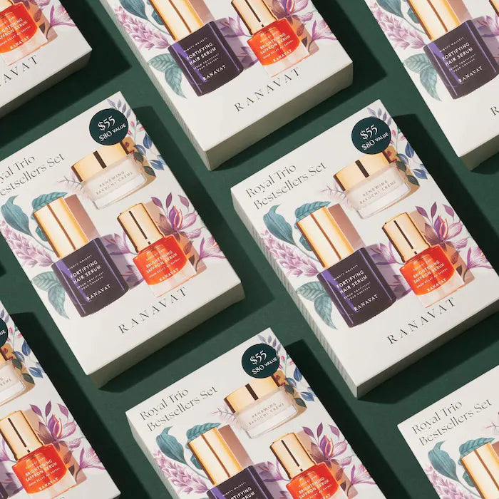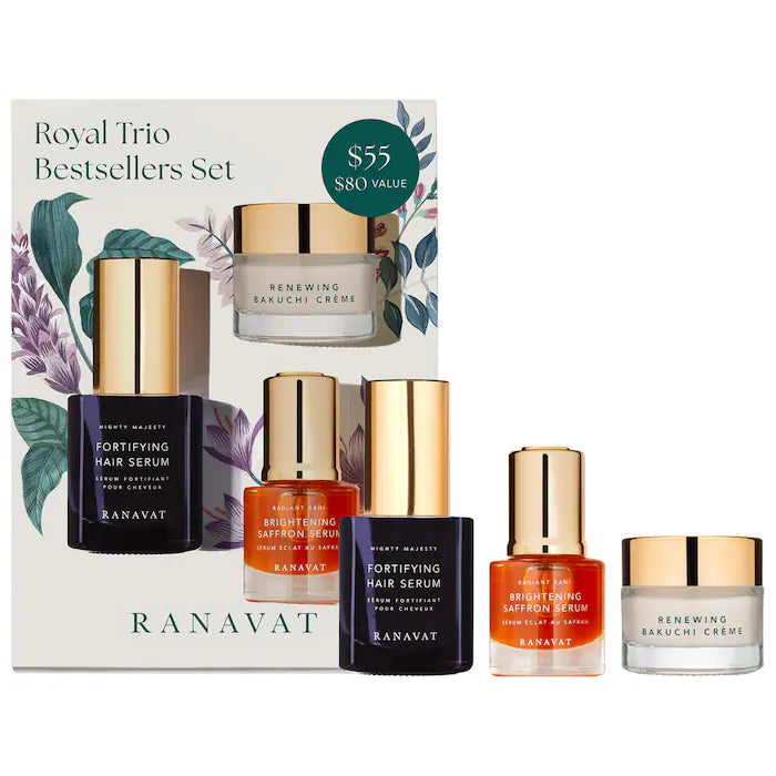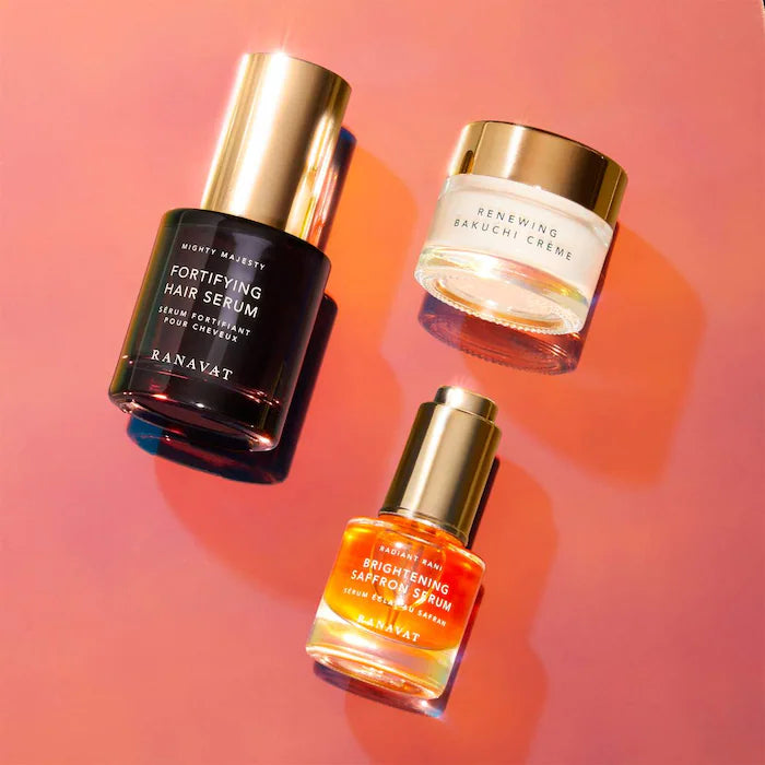 - A set of three bestselling ayurvedic skin and hair treatments in travel-friendly sizes