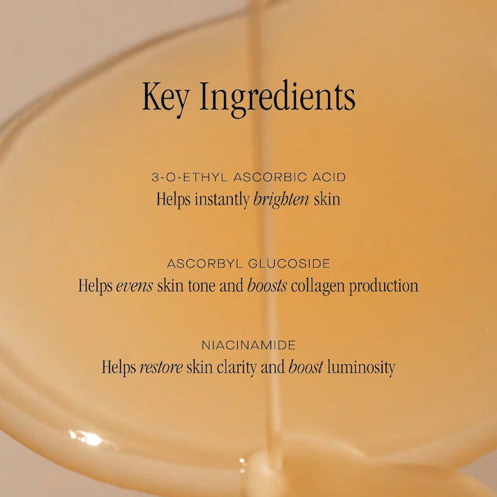 Water (Aqua, Eau), Niacinamide, Butylene Glycol, 3-O-Ethyl Ascorbic Acid, Ascorbyl Glucoside, Glycerin, Capryloyl Glycerin/Sebacic Acid Copolymer, Hydroxyethyl Acrylate/Sodium Acryloyldimethyl Taurate Copolymer, Squalane, Sodium Citrate, Phenoxyethanol, Sodium Hydroxide, Citric Acid, Diheptyl Succinate, Tocopheryl Acetate, Xanthan Gum, Tetrasodium Glutamate Diacetate, Carbomer, Polysorbate 20, Palmitoyl Oligopeptide, Palmitoyl Tetrapeptide-3, Camellia Oleifera Leaf Extract, Ethylhexylglycerin, Orchis Mascula Flower Extract, Caprylic/Capric Triglyceride, Cananga Odorata Flower Extract, Cucumis Melo Cantalupensis Fruit Extract, Eugenia Caryophyllus (Clove) Flower Extract, Glycine Soja (Soybean) Oil, Pyrus Malus (Apple) Fruit Extract, Prunus Armeniaca (Apricot) Fruit Extract, Rosa Gallica Flower Extract, Cinnamomum Cassia Bark Extract, Jasminum Officinale (Jasmine) Flower/Leaf Extract, Coffea Arabica (Coffee) Leaf/Seed Extract, Camellia Sinensis Leaf Extract, Amyl Cinnamal, Cinnamyl Alcohol, Citronellol, Eugenol, Hydroxycitronellal