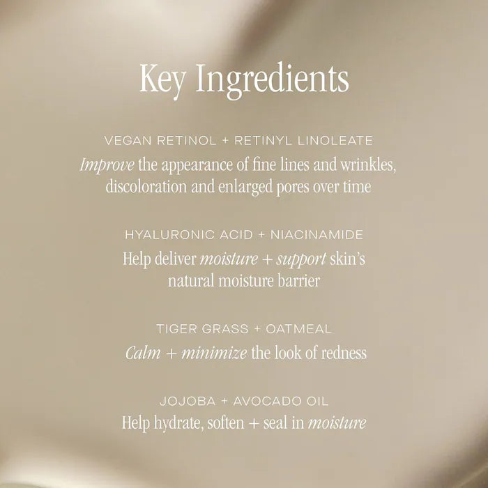 Water/Aqua/Eau, Glycerin, Squalane, Caprylic/Capric Triglyceride, Cetearyl Alcohol, Glyceryl Stearate SE, Simmondsia Chinensis (Jojoba) Seed Oil, Propanediol, Sorbitan Stearate, Sclerotium Gum, Retinyl Linoleate, Retinol, Avena Sativa (Oat) Bran Extract, Centella Asiatica Extract, Niacinamide, Bisabolol, Rosa Canina Fruit Oil, Persea Gratissima (Avocado) Oil, Prunus Amygdalus Dulcis (Sweet Almond) Oil, Butyrospermum Parkii (Shea) Butter, Sodium Hyaluronate, Ricinus Communis (Castor) Seed Oil, Hydrogenated Castor Oil, Glycine Soja (Soybean) Oil, Tocopherol, Tocopheryl Acetate, Phytic Acid, Synthetic Beeswax, Copernicia Cerifera (Carnauba) Wax/Copernicia Cerifera Cera/Cire de carnauba, Maltodextrin, Caprylhydroxamic Acid, 1,2-Hexanediol, Sodium Benzoate, Potassium Sorbate, Levulinic Acid, Sodium Levulinate, Citric Acid, Sodium Hydroxide