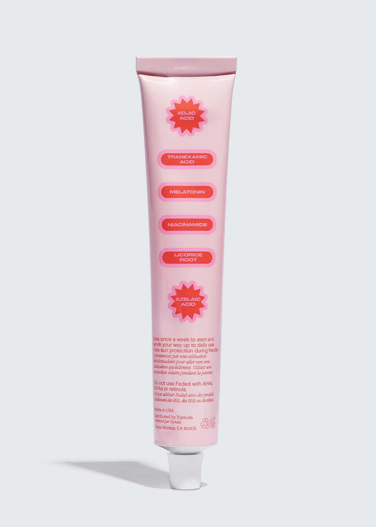 Water/Aqua/Eau, Caprylic/Capric Triglyceride, Glycerin, Niacinamide, Glyceryl Stearate, Tranexamic Acid, Butyrospermum Parkii (Shea) Butter, Simmondsia Chinensis (Jojoba) Seed Oil, Alpha-Arbutin, Behenyl Alcohol, Kojic Acid Dipalmitate, Gluthathione, Turmeric Butter, Ethylene Brassylate, Dimethylmethoxy Chromanyl Palmitate, Azelaic Acid, Glycyrrhiza Uralensis (Licorice) Root Extract, Melatonin, Phytic Acid, Squalane, Allantoin, Centella Asiatica Leaf Extract, Tocopherol, Arginine, Lecithin, Glycine Soja (Soybean) Sterols, Cetyl Palmitate, Ethylhexylglycerin, Sclerotium Gum, Zinc Ricinoleate, Cetearyl Alcohol, Sodium Lauroyl Sarcosinate, Tetrahydroxypropyl Ethylenediamine, Trisodium Ethylenediamine Disuccinate, Ceteareth-12, Ceteareth-20, Phenoxyethanol.